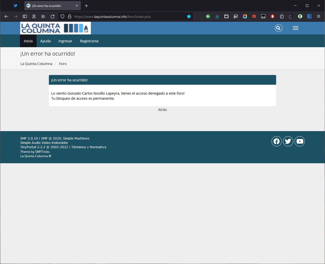 También comentar que pocos días antes fui baneado del foro de la Quinta Columna en Telegram por el mismo motivo. En este post de burbuja.info lo explico.