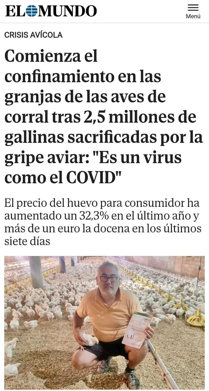 - «Comienza el confinamiento en las granjas de las aves de corral tras 2,5 millones de gallinas sacrificadas por la gripe aviar: «Es un virus como el COVID». El precio del huevo para consumidor ha aumentado un 32,3% en el último año y más de un euro la docena en los últimos siete días.» (10 nov.2025). (elmundo.es).