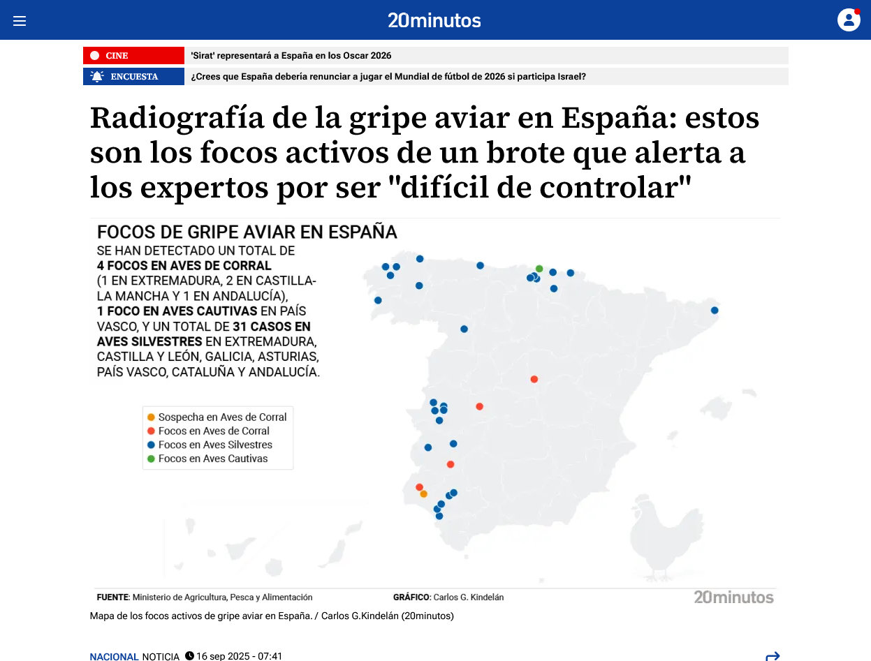 - «España confina desde este lunes aves de casi 1.200 municipios para frenar el avance de la gripe aviar.» (10 nov.2025). (20minutos.es).